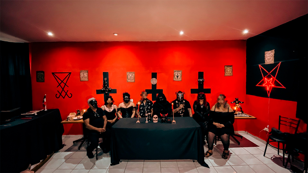 Las imágenes compartidas en sus plataformas muestran a ocho personas vestidas de negro y con el rostro cubierto, reunidas entre símbolos como pentagramas, cráneos y cruces invertidas. En los altares también aparecen representaciones de Baphomet, Belial, Leviatán y la Santa Muerte, junto con un tablero Ouija.