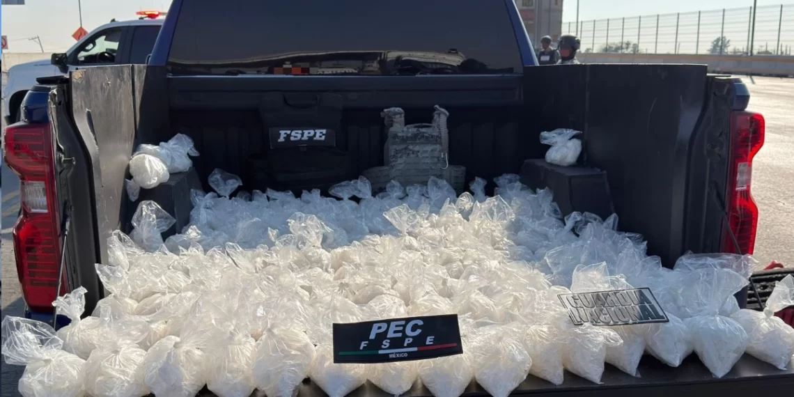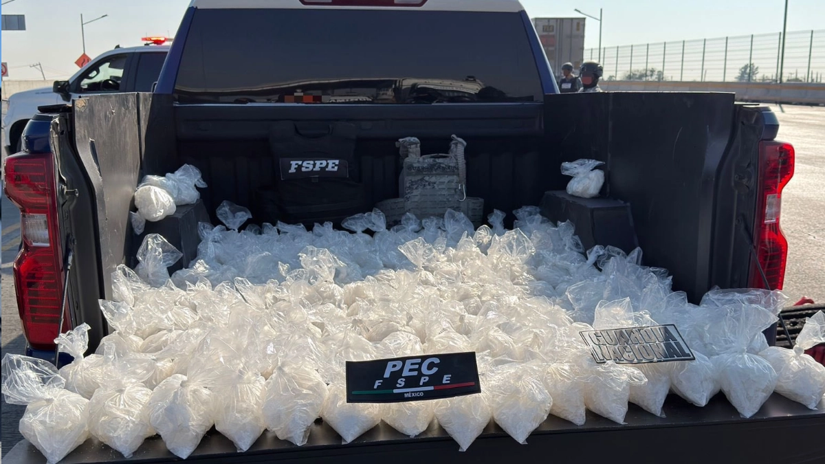 Durante la entrevista con los ocupantes, los oficiales detectaron indicios que derivaron en una inspección más detallada. En el vehículo fue localizado un compartimento manipulado que ocultaba 149 bolsas con sustancia sólida, cristalina y granulada con características propias de la metanfetamina.