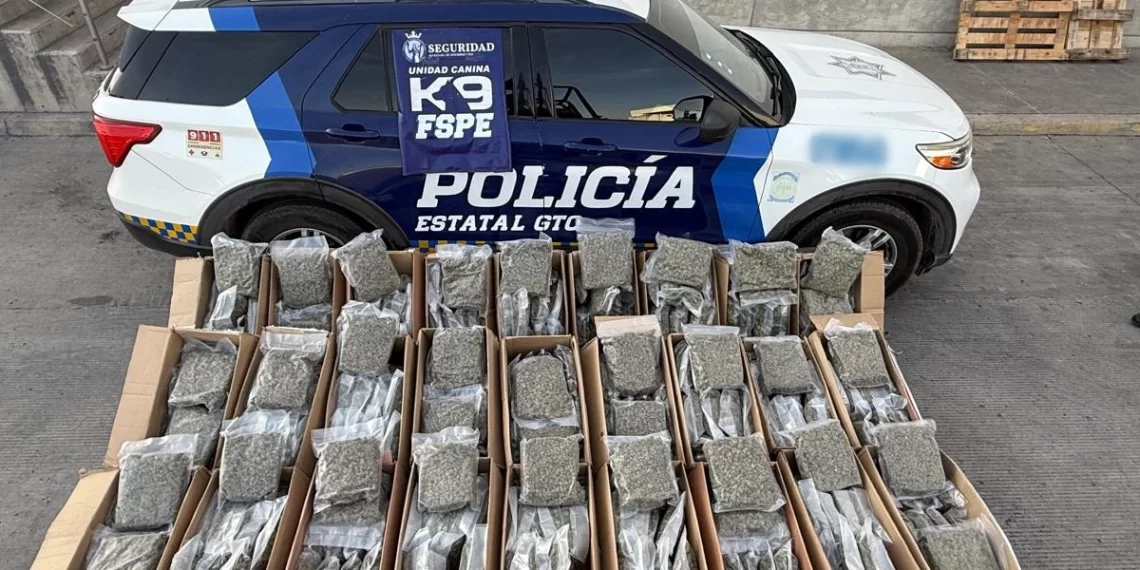 Guanajuato- Más de 160 kilogramos de marihuana fueron asegurados al interior de una bodega de una empresa de paquetería en el estado de Guanajuato, droga que presuntamente sería enviada a los estados de San Luis Potosí y Querétaro.