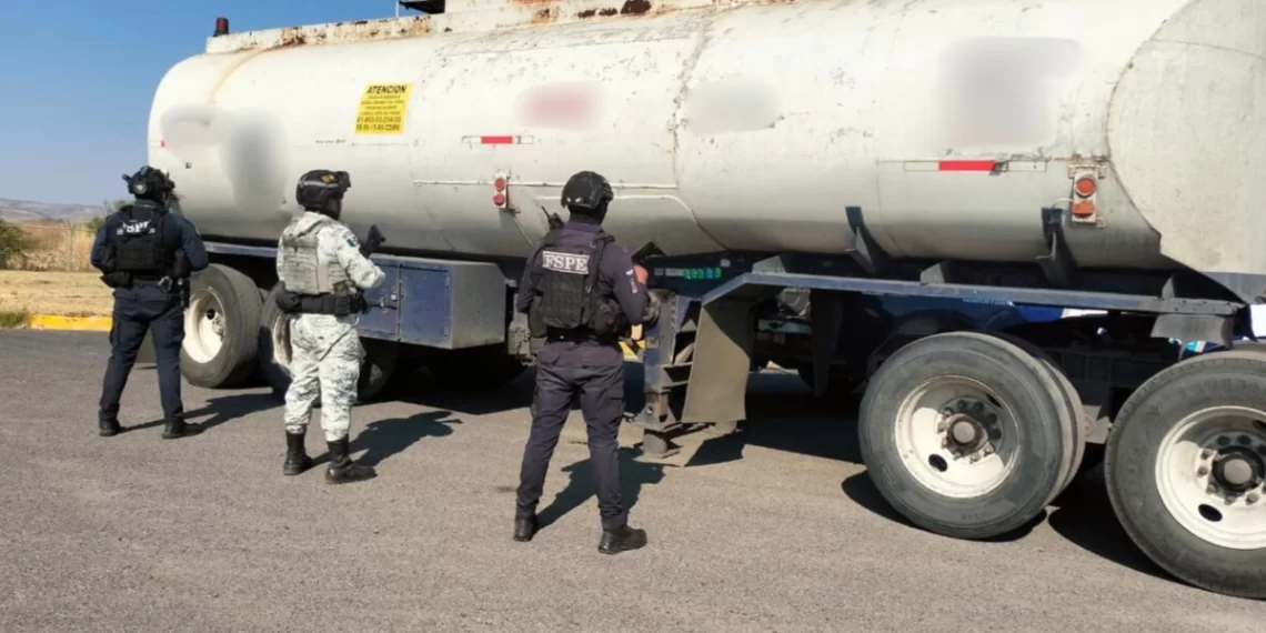 Guanajuato- Elementos de las Fuerzas de Seguridad Pública del Estado (FSPE), en coordinación con la Guardia Nacional, aseguraron un tractocamión que transportaba aproximadamente 31 mil 500 litros de hidrocarburo sin acreditar su procedencia legal en la comunidad de San Antonio de Maravillas, como parte de acciones de vigilancia en Guanajuato.