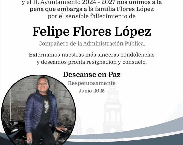 El Gobierno Municipal de Santiago Maravatío, encabezado por el alcalde Guadalupe Paniagua, compartió una esquela expresanfo sus condolencias a familiares y amigos de Felipe.