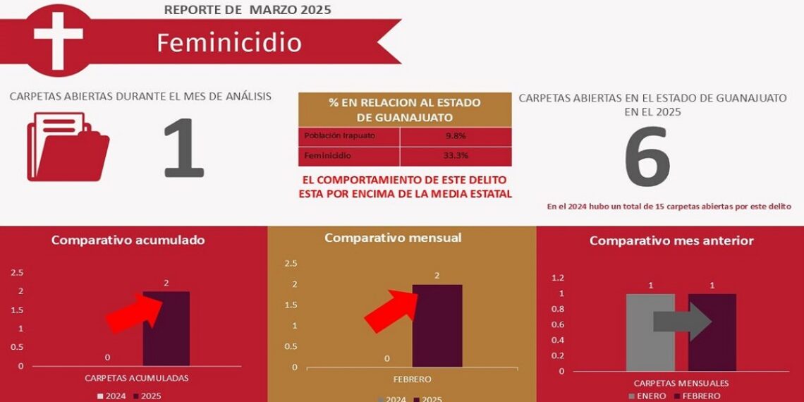 Durante el mes de marzo 2025 se registró solo una carpeta por Feminicidio que comparada con el mes de marzo 2024 registró aumento; al igual que el delito de Secuestro.