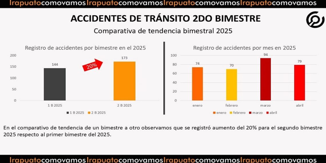En este periodo, se registraron 173 accidentes de tránsito, cifra que indica que cada 8 horas y 27 minutos ocurrió un accidente vial en Irapuato (zona urbana).