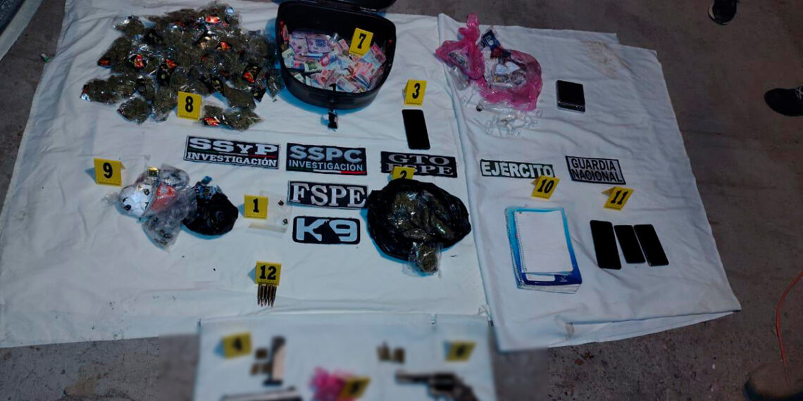 Irapuato- La lucha contra el crimen organizado en Guanajuato sumó un nuevo capítulo tras el cateo realizado en la localidad de La Calera, donde autoridades estatales y federales lograron el aseguramiento de armas de fuego, drogas listas para su distribución, cartuchos útiles, dinero en efectivo, vehículos y teléfonos celulares.