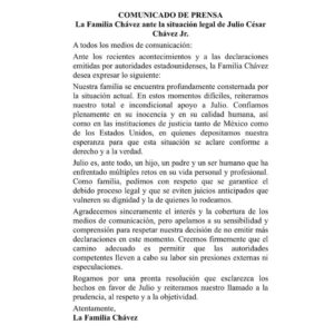 “Nuestra familia se encuentra profundamente consternada por la situación actual. En estos momentos difíciles, reiteramos nuestro total e incondicional apoyo a Julio. Confiamos plenamente en su inocencia y en su calidad humana”.