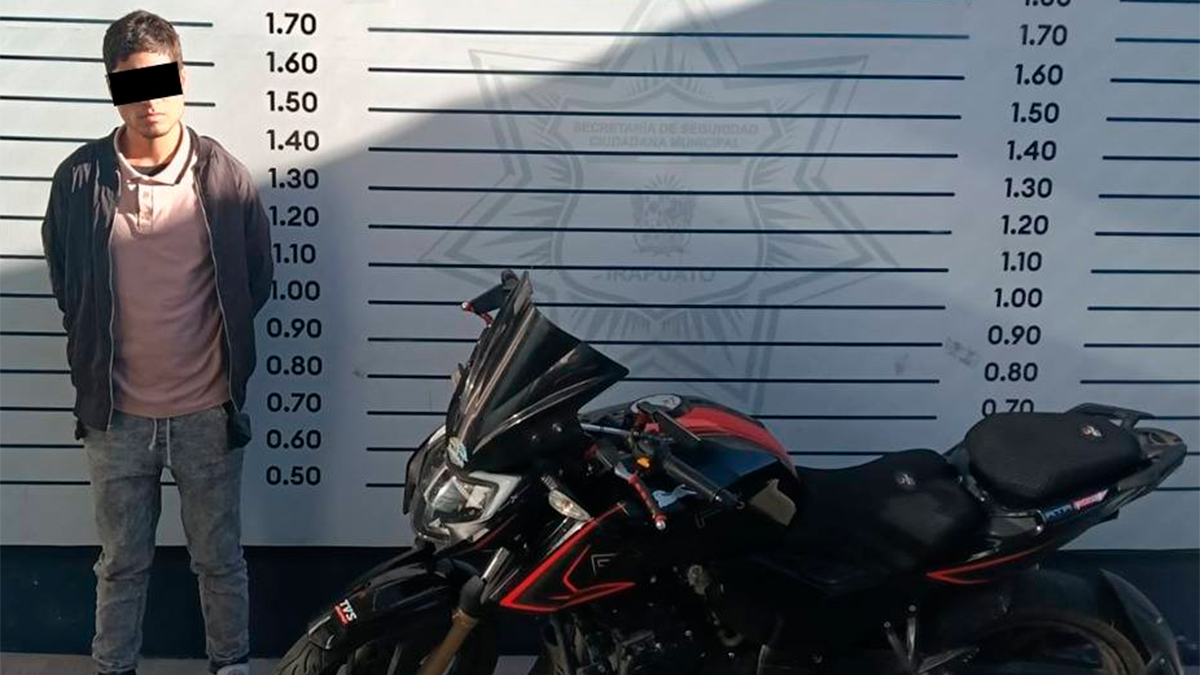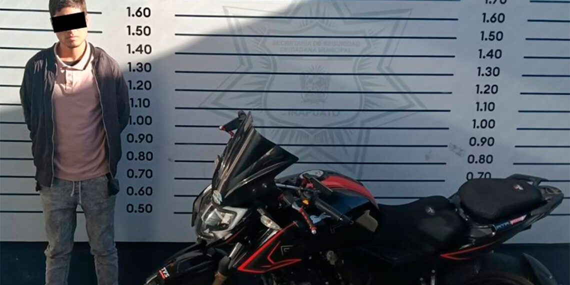 Irapuato- Una rápida movilización de la Policía Municipal de Irapuato permitió la detención de un joven de 23 años, señalado como responsable del robo de una motocicleta en pleno fraccionamiento Tierra Nueva. El operativo, activado tras un reporte ciudadano, concluyó con la recuperación del vehículo y la captura del sospechoso, quien acumula al menos ocho ingresos a prisión por diversos delitos.