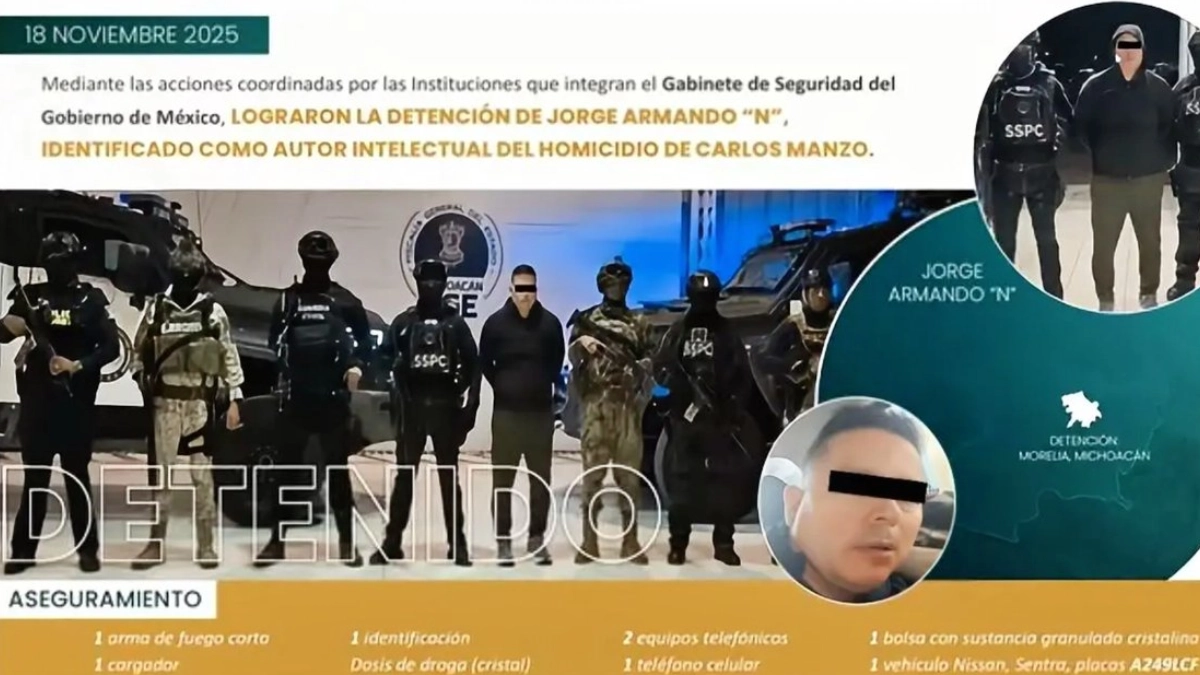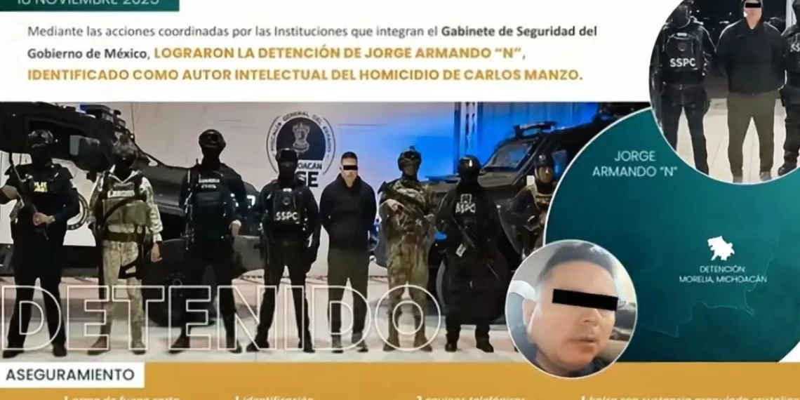 Ciudad de México— Omar García Harfuch, secretario de Seguridad Pública y Protección Ciudadana, informó la detención de Jorge Armando “N”, señalado como uno de los autores intelectuales del asesinato de Carlos Manzo, exalcalde de Uruapan, Michoacán. Su captura se realizó en la colonia Centro de Morelia mediante un operativo conjunto del Gabinete de Seguridad, la Fiscalía de Michoacán y la Secretaría de Seguridad estatal.