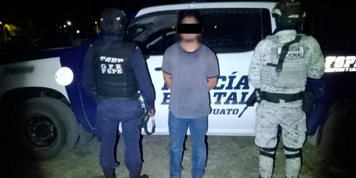 Los hechos se registraron durante un patrullaje preventivo en la calle Moroleón, en la colonia Plan de Guanajuato, donde los elementos detectaron a un sujeto que, al percatarse de la presencia policial, adoptó una actitud evasiva e intentó ocultarse junto a un vehículo.