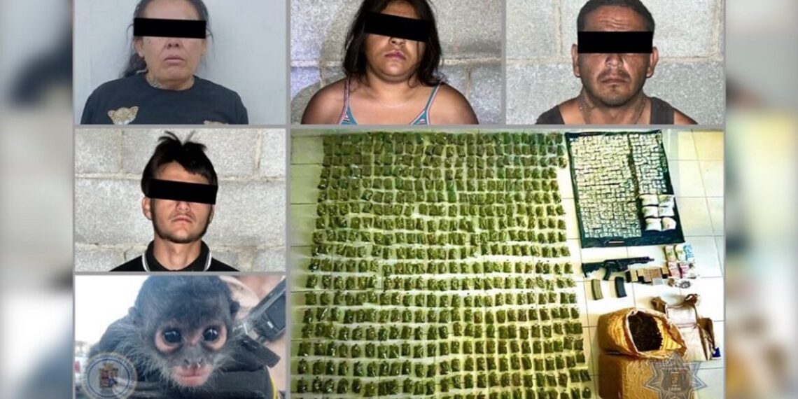 León.– Elementos de la Policía Municipal detuvieron a cuatro presuntos distribuidores de droga y aseguraron a un mono araña que se encontraba en posesión de los detenidos.