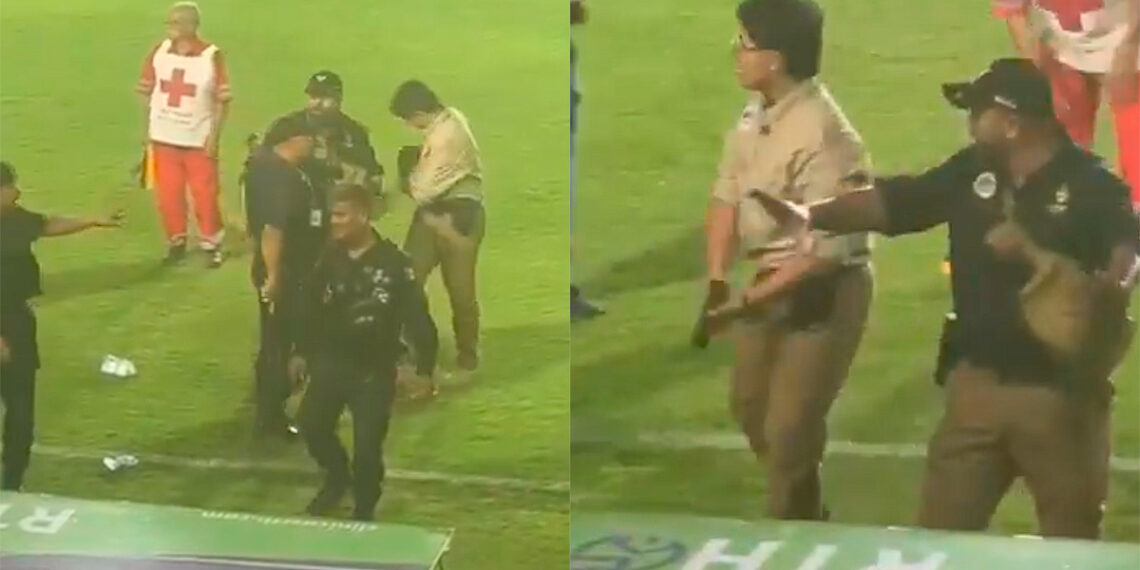 El incidente provocó una invasión de cancha por parte de los asistentes, quienes arrojaron objetos y persiguieron al individuo, llegando incluso a golpearlo tras su caída en el césped. Otros policías, equipados con chalecos y macanas, intentaron protegerlo y contener la gresca, aunque con dificultades.