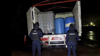 Tras revisar la unidad, confirmaron que tenía reporte de robo y que transportaba seis contenedores de mil 200 litros y dos tambos de 200 litros, con un total aproximado de 6 mil 500 litros de combustible robado.