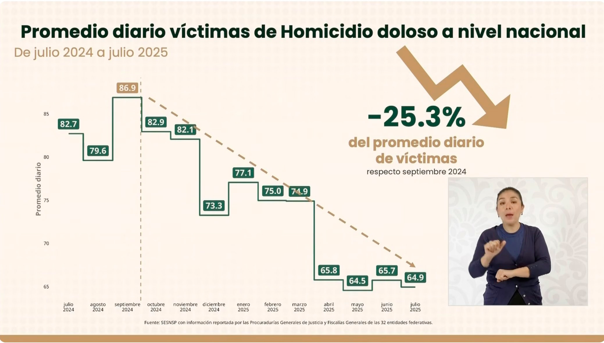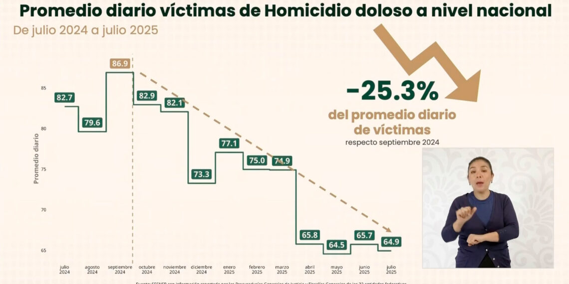 👉 De julio de 2024 a julio de 2025 los homicidios dolosos bajaron 25.3%