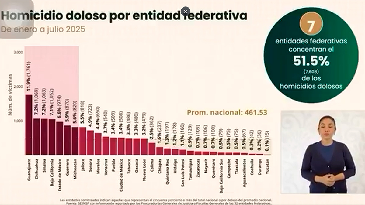 Pese a la mejora, Guanajuato sigue concentrando el 11.9% de los homicidios del país en el acumulado de enero a julio, seguido por Chihuahua y Sinaloa (7.2% cada uno), Baja California (7.1%), Estado de México (6.6%), Guerrero (5.9%) y Michoacán (5.6%).
