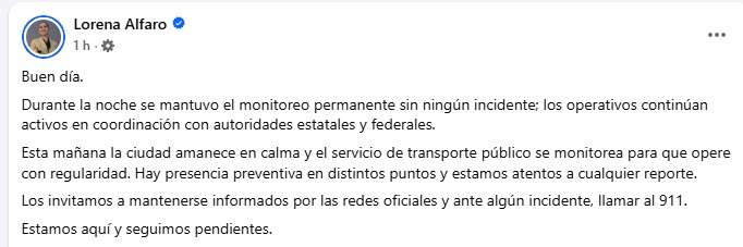 A través de sus redes sociales, la presidenta municipal señaló que la ciudad amaneció en calma y que el servicio de transporte público es supervisado para garantizar su operación regular. Asimismo, destacó la presencia preventiva en distintos puntos del municipio y reiteró el llamado a la ciudadanía a mantenerse informada por medios oficiales y a reportar cualquier emergencia al 911.