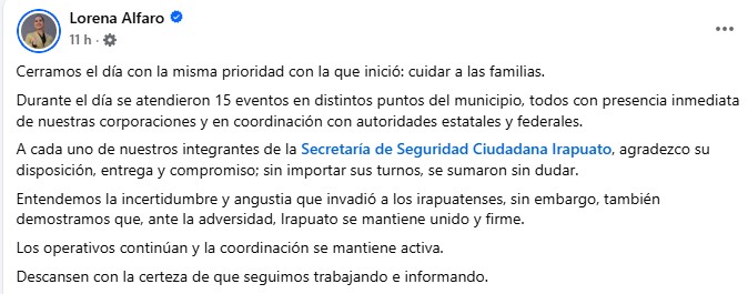 Irapuato- La alcaldesa de Irapuato, Lorena Alfaro García, informó que durante la noche se mantuvo un monitoreo permanente sin que se registraran incidentes, y que los operativos de seguridad continúan activos en coordinación con autoridades estatales y federales.