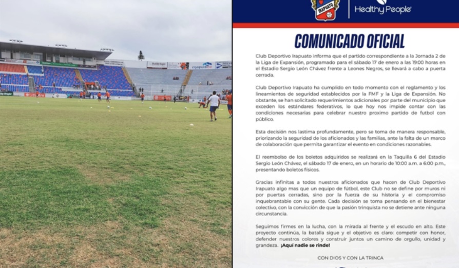 El Club Deportivo Irapuato destacó que ha cumplido con todas las disposiciones reglamentarias y de seguridad establecidas por la FMF y la Liga de Expansión, aunque reconoció que la decisión representa un golpe doloroso para la institución, al tratarse de un equipo históricamente respaldado por su afición.
