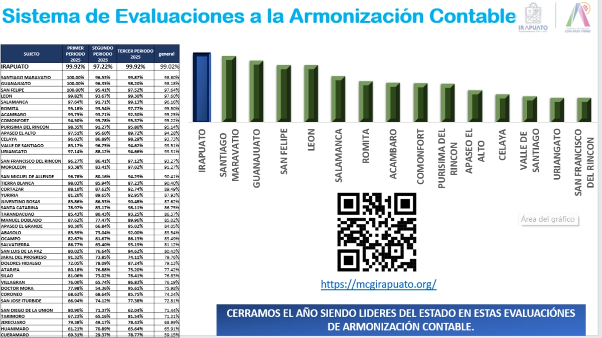 Irapuato- El municipio de Irapuato se posicionó en el primer lugar del estado de Guanajuato en la evaluación del Sistema de Evaluaciones de la Armonización Contable (SEvAC), instrumento que mide el cumplimiento en registros contables, presupuestales, administrativos, así como en la integración de la cuenta pública y transparencia.