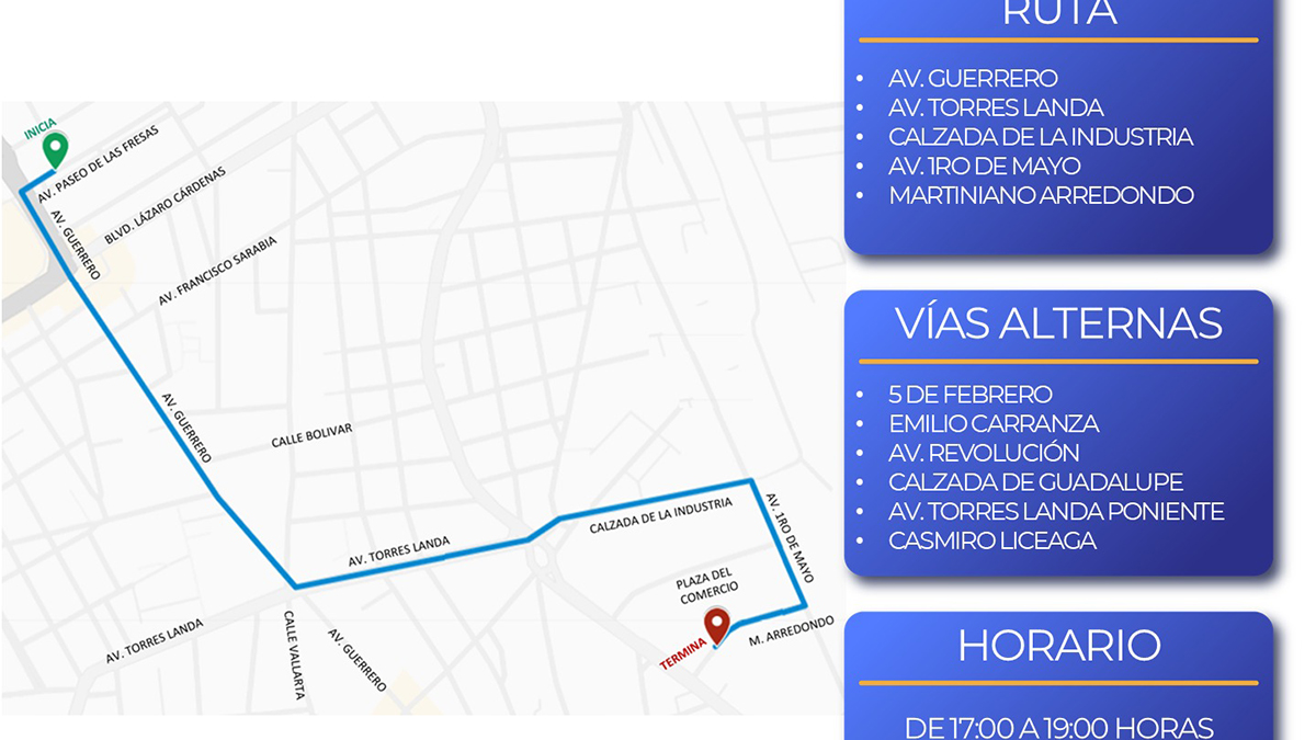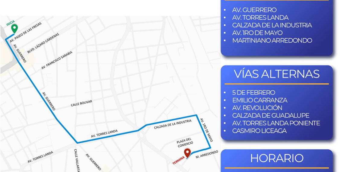Asimismo, la dirección de Tránsito informó que las rutas alternas recomendadas serán las calles 5 de Febrero y Emiliano Carranza, la avenida Revolución, la Calzada de Guadalupe —desde el tramo poniente de Torres Landa— y la avenida Casimiro Liceaga.