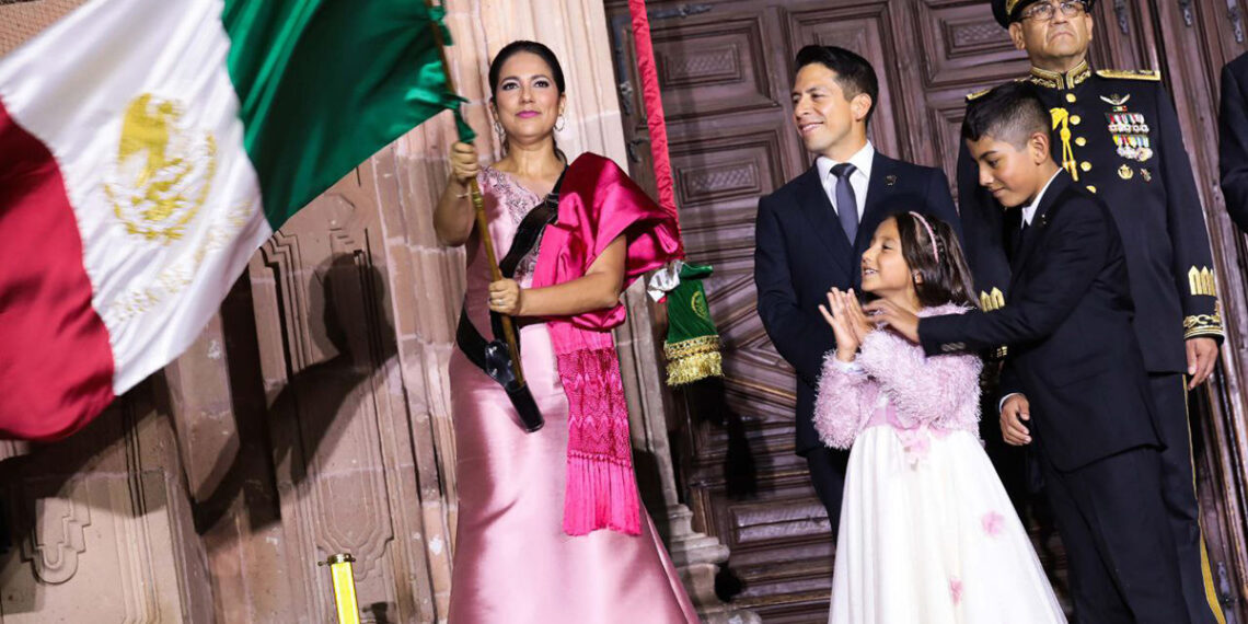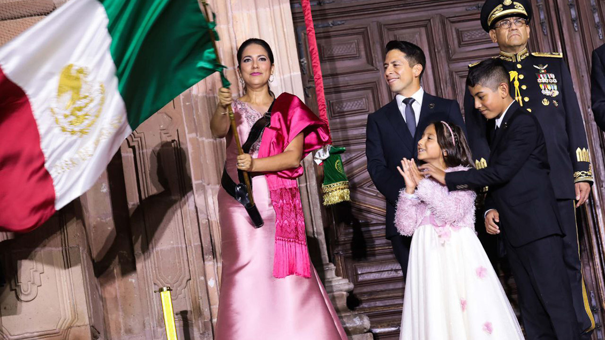 Libia Dennise, desde la puerta de la Parroquia de Dolores, rindió homenaje al inicio del movimiento Insurgente y evocó el llamado de Don Miguel Hidalgo y Costilla para levantarse en armas, aquella madrugada del 16 de septiembre de 1810.