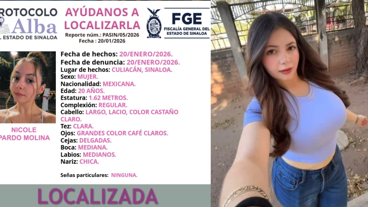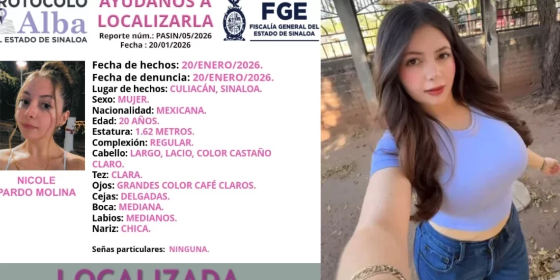 Sinaloa- La Fiscalía General del Estado de Sinaloa informó la localización de Nicole ‘Nicholette’ Pardo Molina, influencer de 20 años que había sido reportada como desaparecida desde el pasado 20 de enero en la ciudad de Culiacán. La dependencia dio a conocer la noticia a través de sus redes sociales, donde agradeció la colaboración de la ciudadanía durante el proceso de búsqueda.