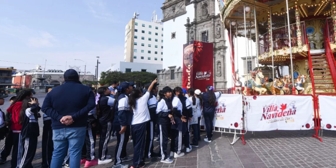 Irapuato- Niñas y niños de escuelas de la zona rural y urbana de Irapuato disfrutaron de un recorrido especial por la Villa Navideña, Fiestas de Paz, gracias al apoyo del Gobierno Municipal a través de la Dirección de Educación, que facilitó de manera gratuita el traslado de las y los estudiantes para vivir esta experiencia.