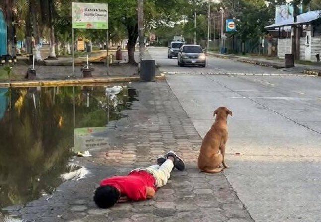 Las fotos del lomito café sentado junto a un hombre tendido sobre el suelo, vestido con playera roja y pantalón gris, fueron captadas en el barrio El Porvenir, en Puerto Cortés, Honduras.