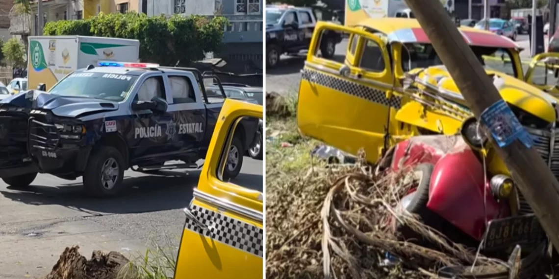 Guadalajara- Un fuerte accidente de tránsito se registró en calles de Guadalajara, Jalisco, donde un elemento de la Policía Estatal colisionó contra un automóvil de colección, presuntamente al circular a exceso de velocidad, lo que dejó cuantiosos daños materiales.
