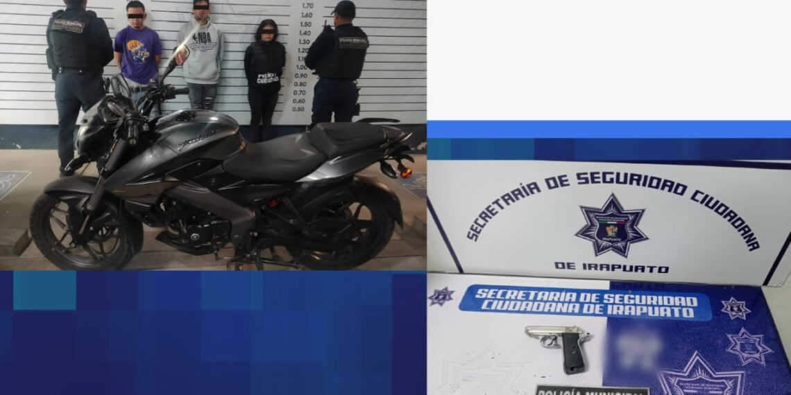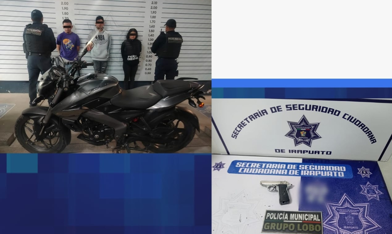 Irapuato.- En una acción de respuesta inmediata, policías municipales lograron interceptar y detener a dos sujetos y a una mujer que viajaban en una motocicleta, momentos después de que pretendieran despojar de sus pertenencias a una ciudadana, en colonia Progresiva Jaral. Los presuntos delincuentes tenían en su poder un arma de fuego deportiva y diversas dosis de droga.