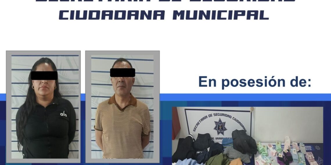 Irapuato.– Como parte del trabajo de coordinación que efectúa La Secretaría de Seguridad Ciudadana con personal de seguridad privada de los diferentes giros comerciales, integrantes de la Policía Municipal detuvieron a una pareja de individuos señalados de intentar sustraer diversa mercancía de un negocio instalado al interior de una plaza comercial de la colonia Ejido Irapuato.
