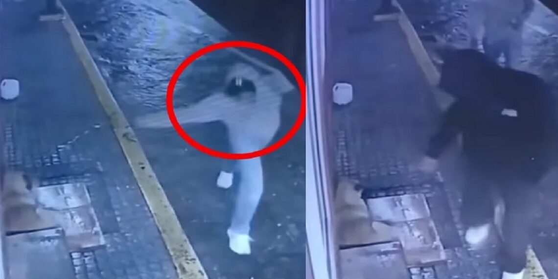 El momento fue grabado por una cámara de seguridad, la cual permitió observar a tres hombres que iban caminando por la calle, mientras un perrito estaba acostado al parecer sobre un cartón, en donde se resguardaba de la tormenta.