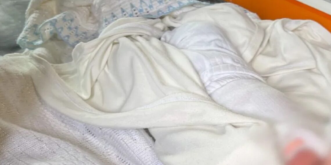 Un hombre salió corriendo llevando a la bebé viva envuelta en una manta y la entregó a un equipo de ambulancia que esperaba. La niña se movía inquieta mientras los paramédicos la revisaban.