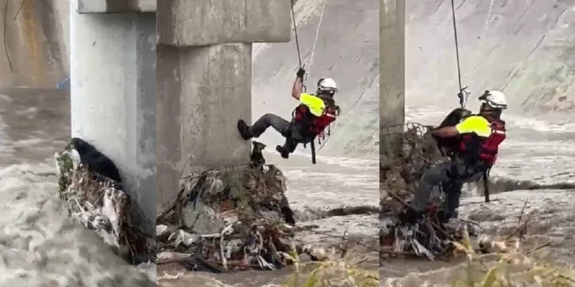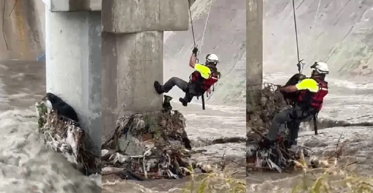 A través de un sistema de cuerdas, uno de los rescatistas bajó al cauce para acercarse al perro, quien se encontraba atrapado en una columna de un puente vehicular, justo en medio de la fuerza del agua.