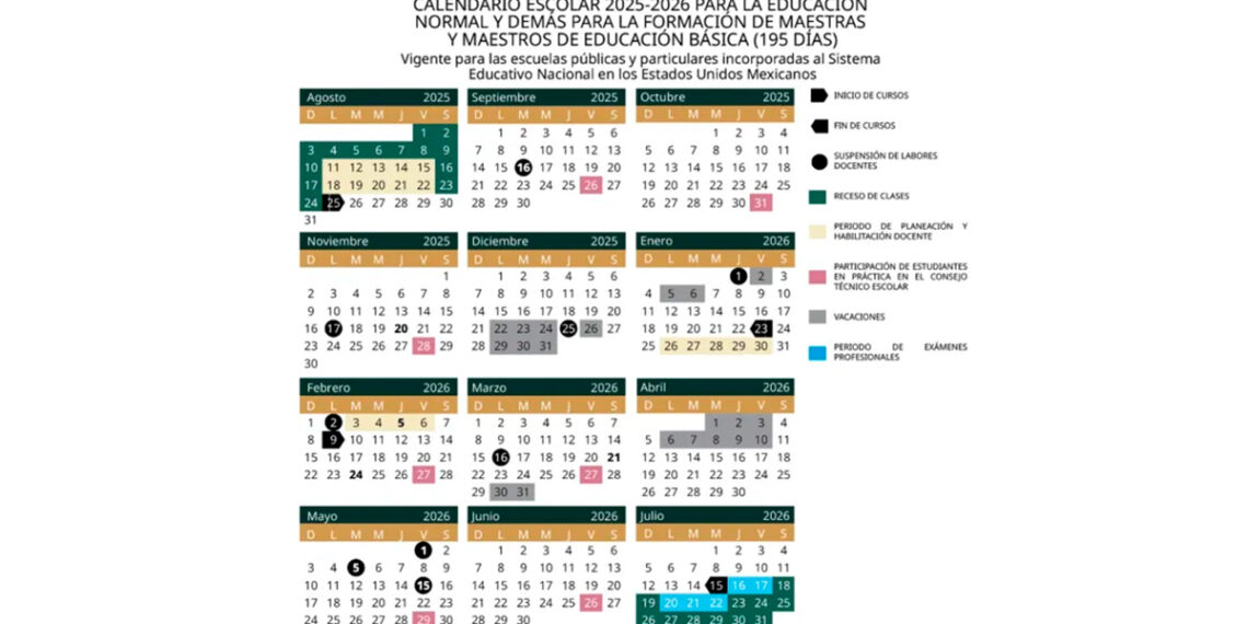 El calendario establece 185 días efectivos de clase para educación básica —preescolar, primaria y secundaria—, y 190 días para escuelas normales, de formación docente y media superior. El inicio de clases será el lunes 1 de septiembre de 2025, mientras que el fin del ciclo escolar será el miércoles 15 de julio de 2026.