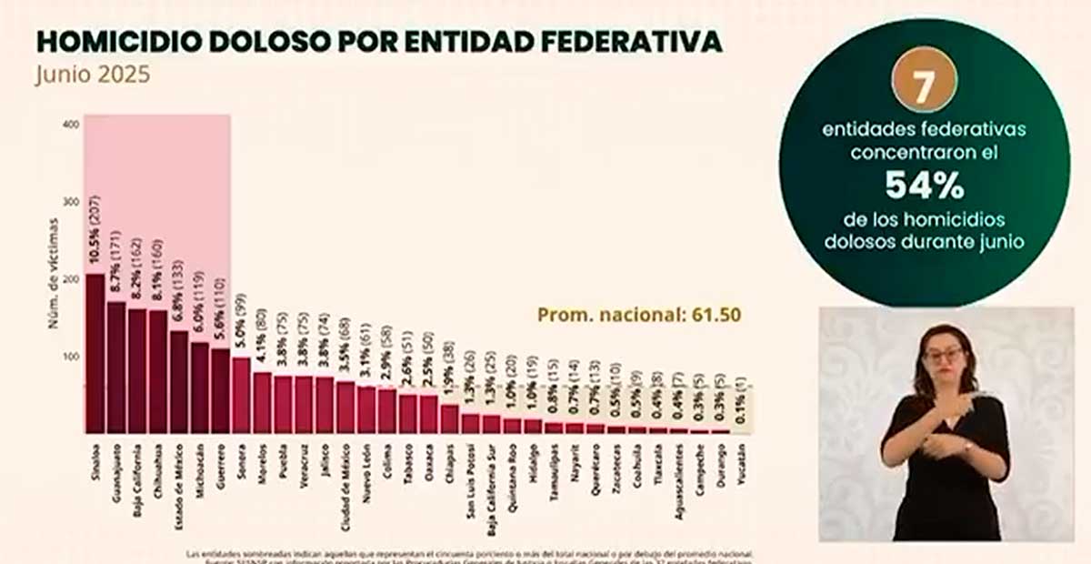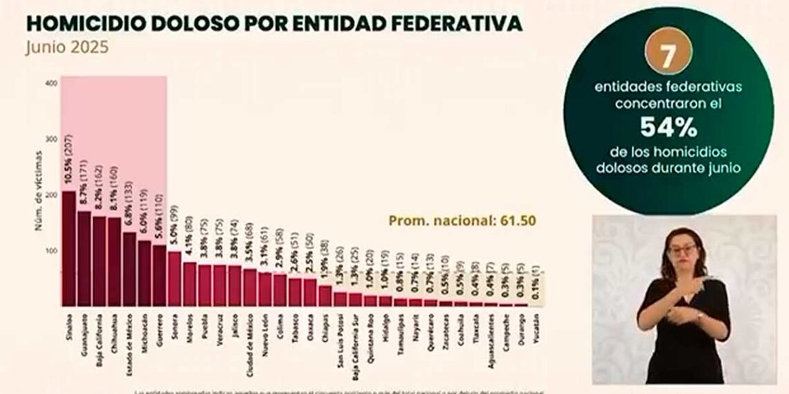 México— El estado de Sinaloa encabezó por primera vez en meses la lista de homicidios dolosos a nivel nacional, superando a Guanajuato, que históricamente había ocupado el primer lugar en víctimas de este delito. De acuerdo con el reporte del Sistema Nacional de Seguridad Pública (SNSP) presentado por Marcela Figueroa, Secretaria Ejecutiva, Sinaloa registró en junio 207 víctimas, lo que equivale al 10.5% del total nacional.